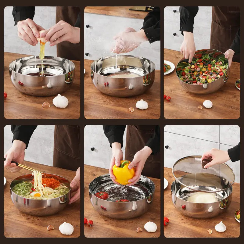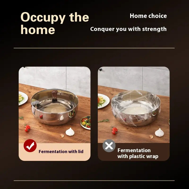 Durable 316 stainless steel dough basin, available with or without lid. Suitable for baking, mixing, or food prep with a simple modern design. Multiple sizes to fit kitchen needs. Food grade, extra thick three-layer steel for safe daily use.