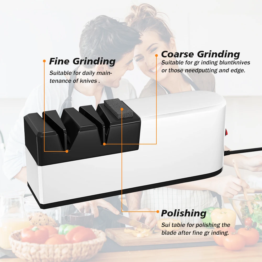 This electric sharpener is equipped with four different specifications of sharpening grooves, which can meet the sharpening needs of various knives, including kitchen knives, scissors, fruit knives, etc. Each sharpening groove is carefully designed to ensure the best sharpening effect for each type of tool.