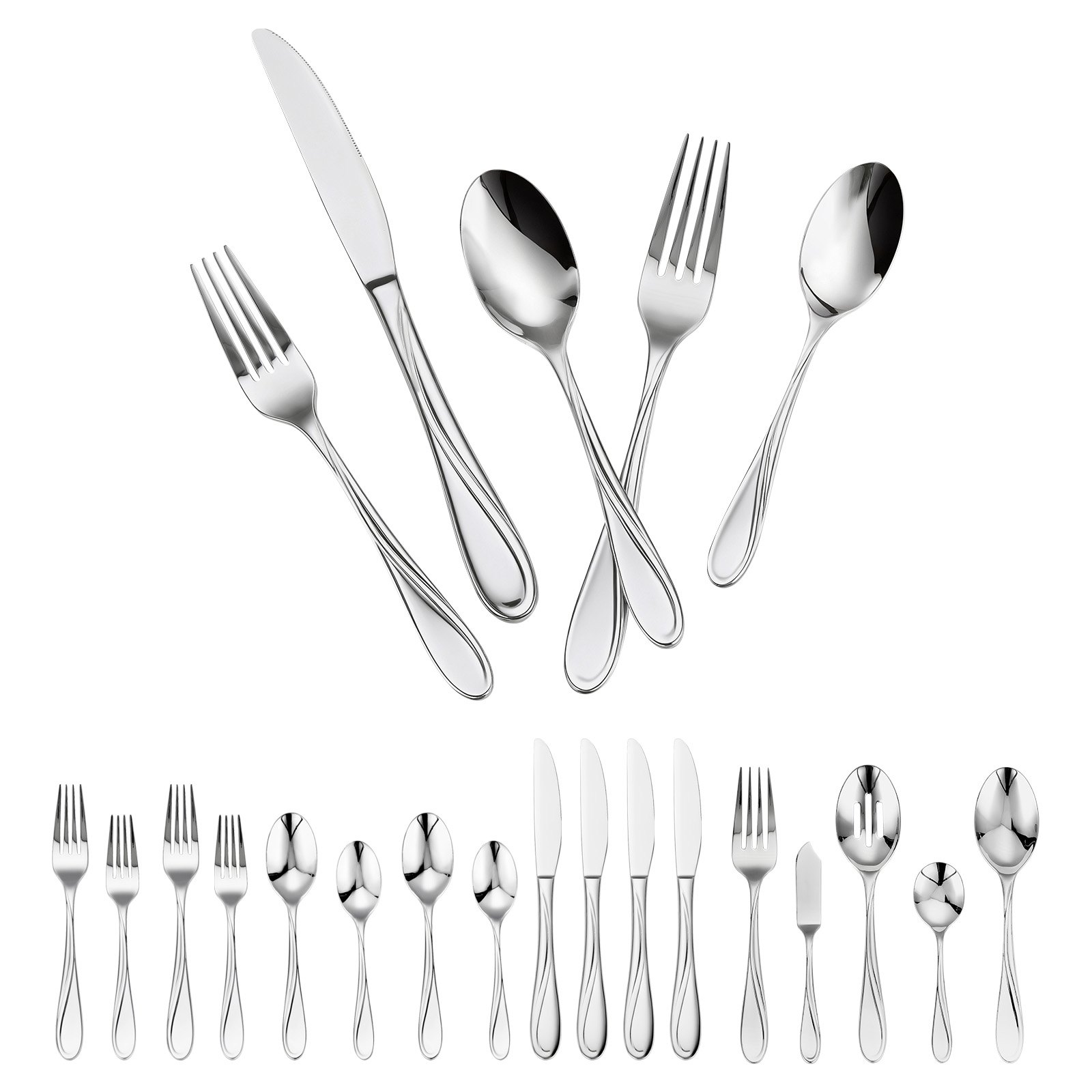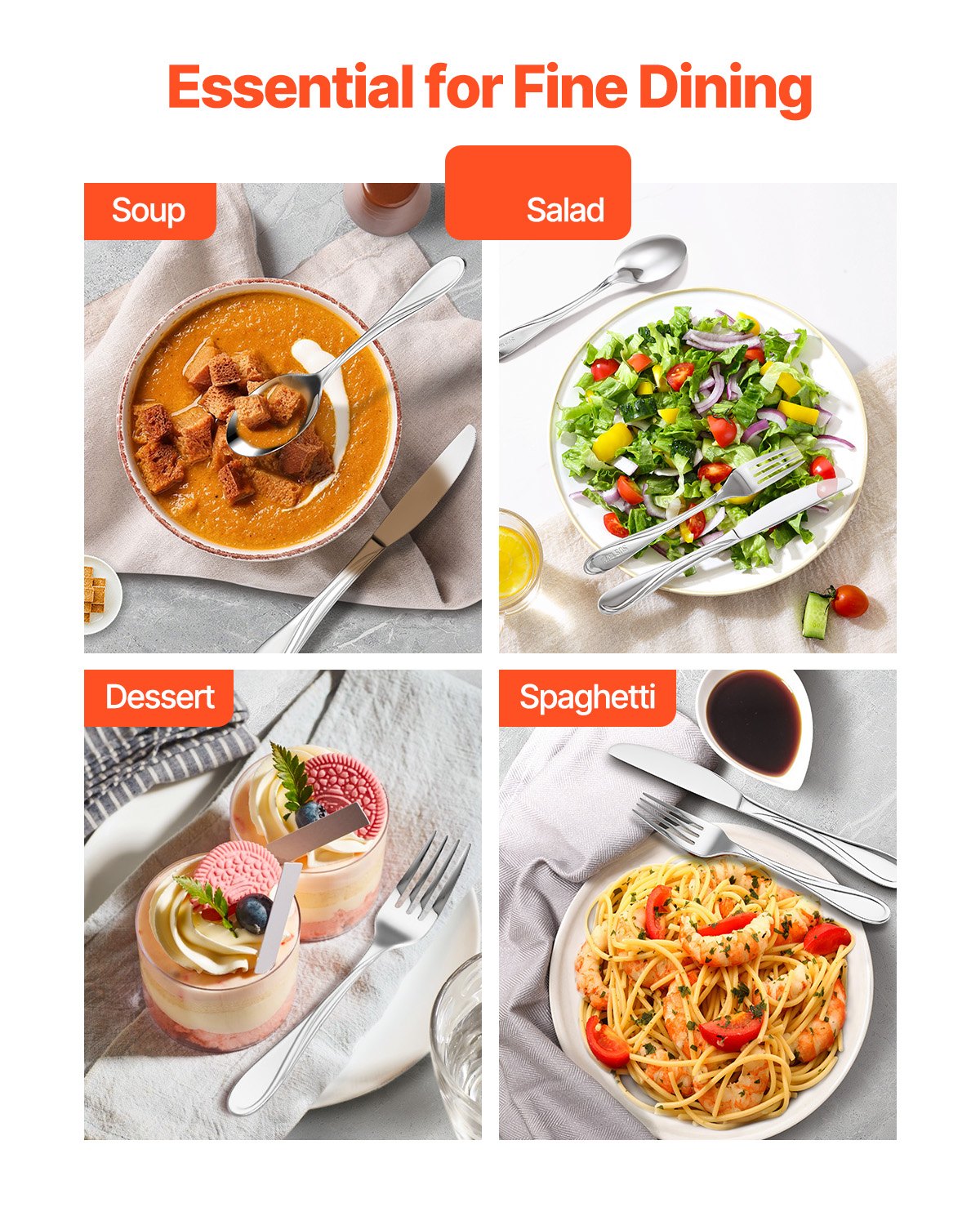 Features & Details 45-Piece Flatware Set: This silverware set includes 8 dessert spoons, 8 dinner spoons, 8 dinner knives, 8 dessert forks, 8 dinner forks, 1 serving fork, 1 serving spoon, 1 sugar spoon, 1 butter knife, and 1 sieve, making it an essential item for both home and restaurant use. Whether for everyday meals, dinner preparation, or parties, this flatware set is an indispensable dining tool High-Quality Stainless Steel: Made from premium 18/10 stainless steel, this tableware cutlery set is durable, corrosion-resistant, and rust-proof with excellent balance. The smooth-edged design ensures comfort during use. Dishwasher safe and perfectly weighted, it is designed for long-lasting use Modern and Elegant Design: The reusable utensil sets for home restaurant features a sleek, modern design that effortlessly complements a variety of table settings, from casual everyday meals to formal occasions. Its refined style enhances your dining experience Easy to Clean: Crafted from high-quality materials, this kitchen utensils set is dishwasher safe and also easy to hand wash. Note: Avoid using steel brushes, hard sponges, or other abrasive cleaning tools to prevent unnecessary scratches to the finish. Be sure to let the flatware dry completely before storing in drawers Versatile Use: This elegant heavy duty stainless steel flatware utensils are a practical and stylish choice for your home, hotel, kitchen, parties, camping, picnics, restaurants, weddings, and more. It adds a touch of sophistication to your life and makes a perfect housewarming or gift option for any occasion