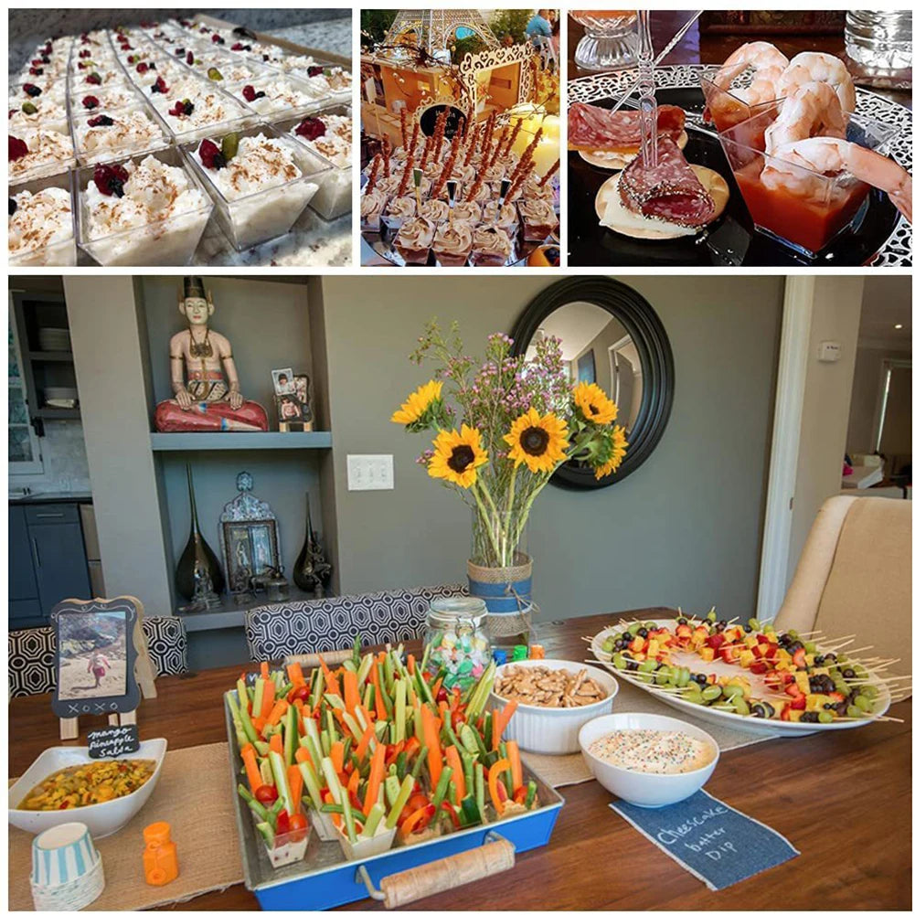 2. High Quality Hard Plastic Material: Our hard disposable appetizer cups are crafted from PS heavy-duty crystal clear plastic, being not easy to break or crack during shipping or using. A and light weight construction of these small dessert cups make a good separation from cup to cup.