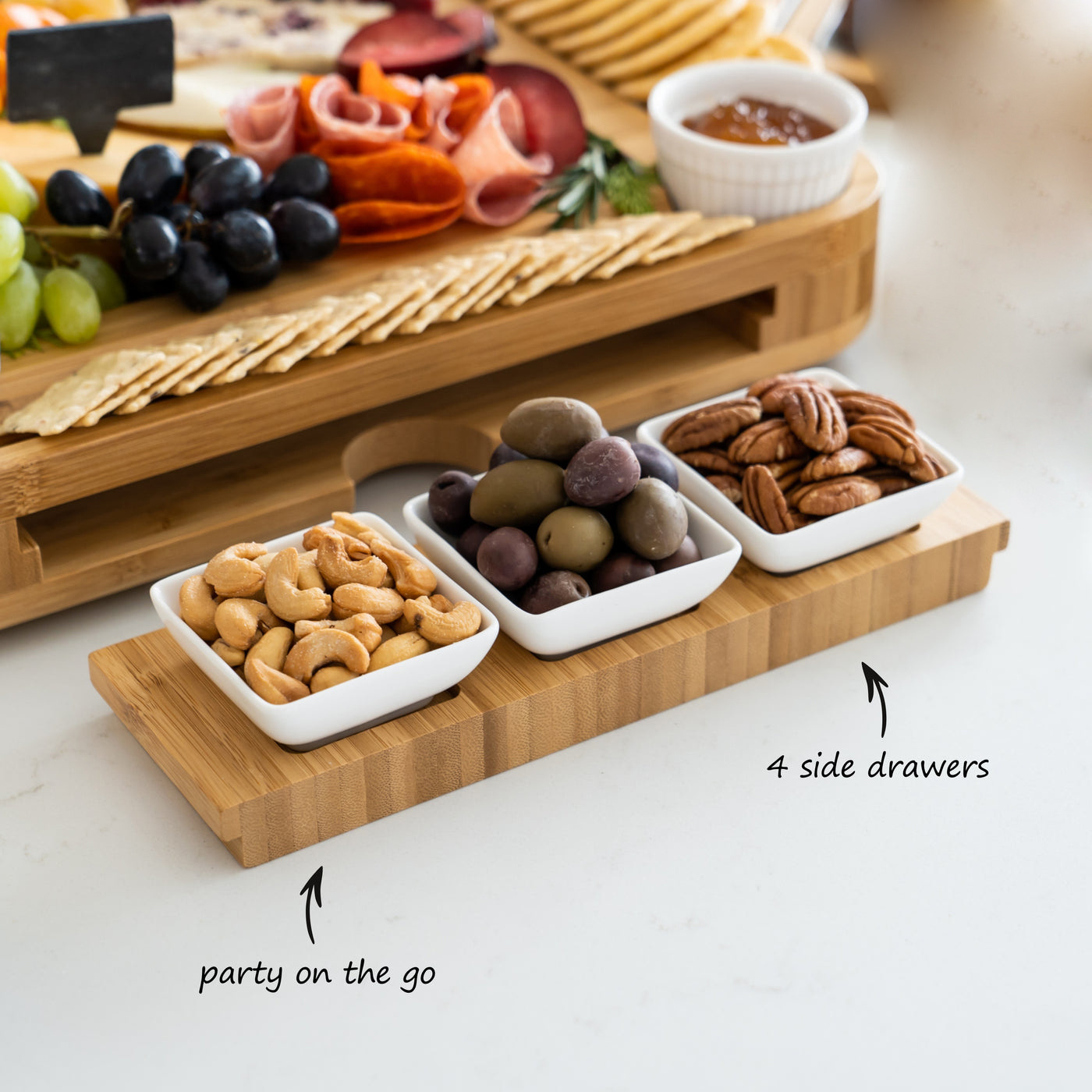 Bamboo Cheese Board Set ? 4-Drawer Charcuterie Platter with Ceramic Bowls & Utensils