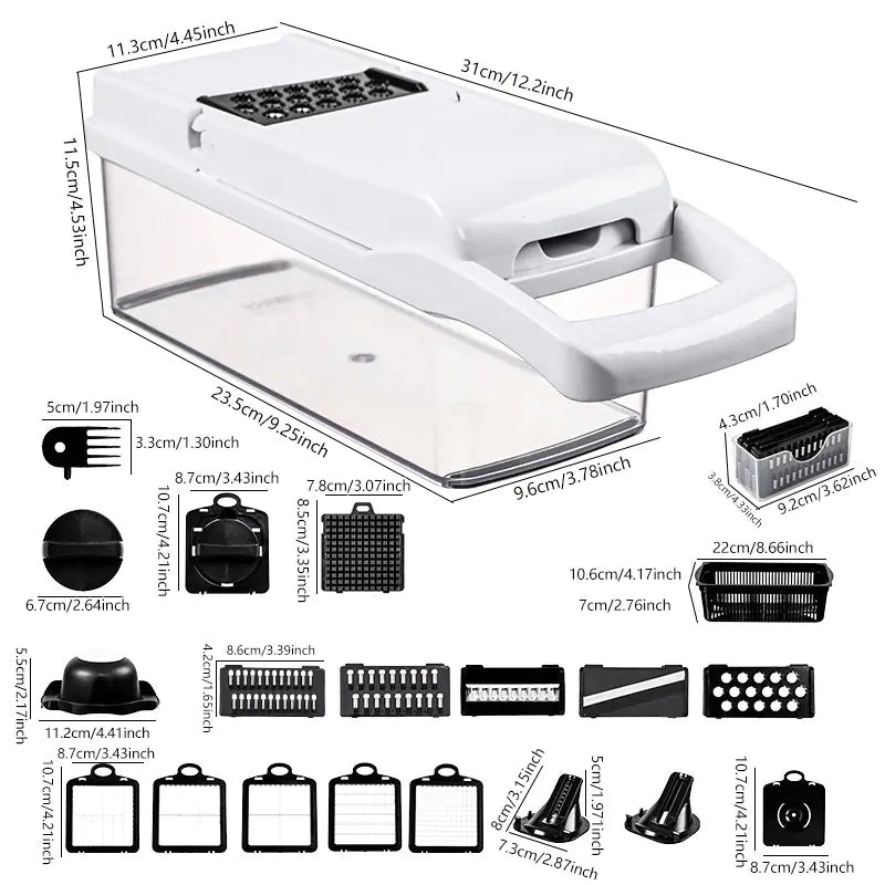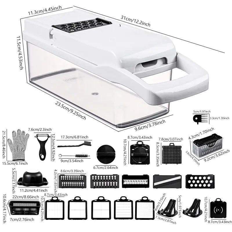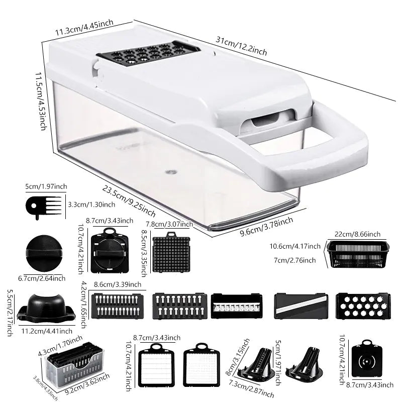 This multi-function vegetable chopper makes slicing, dicing, and chopping vegetables quick and easy. The set includes various attachments for versatile kitchen prep. Made from sturdy ABS, PP, and stainless steel for durability. Ideal for modern kitchens and perfect as a housewarming gift.