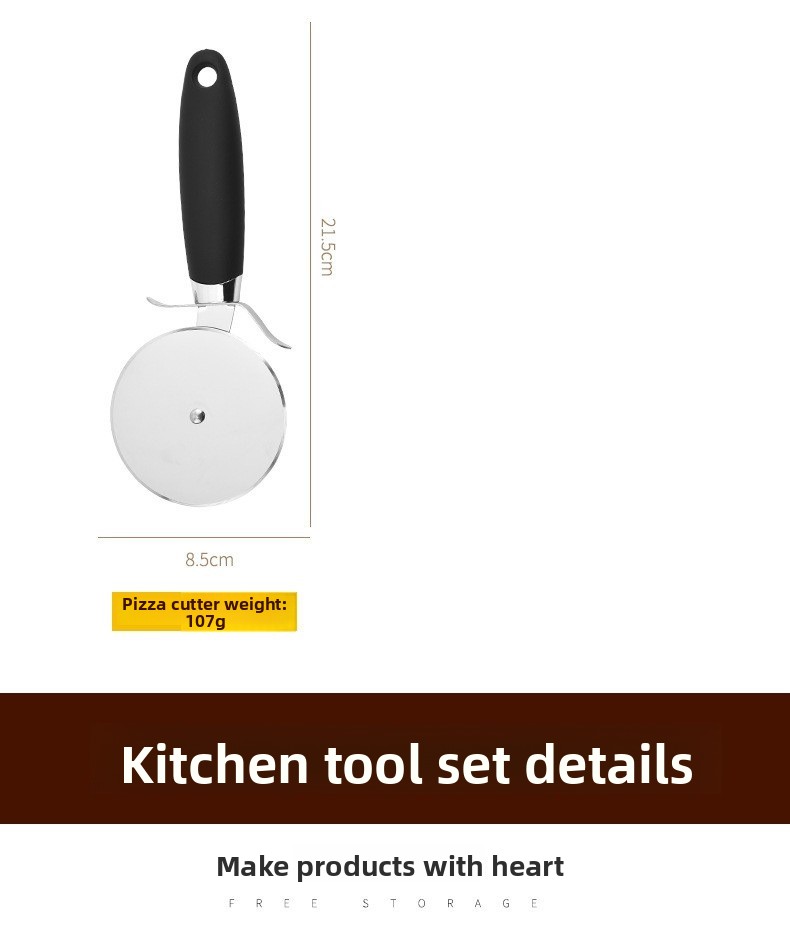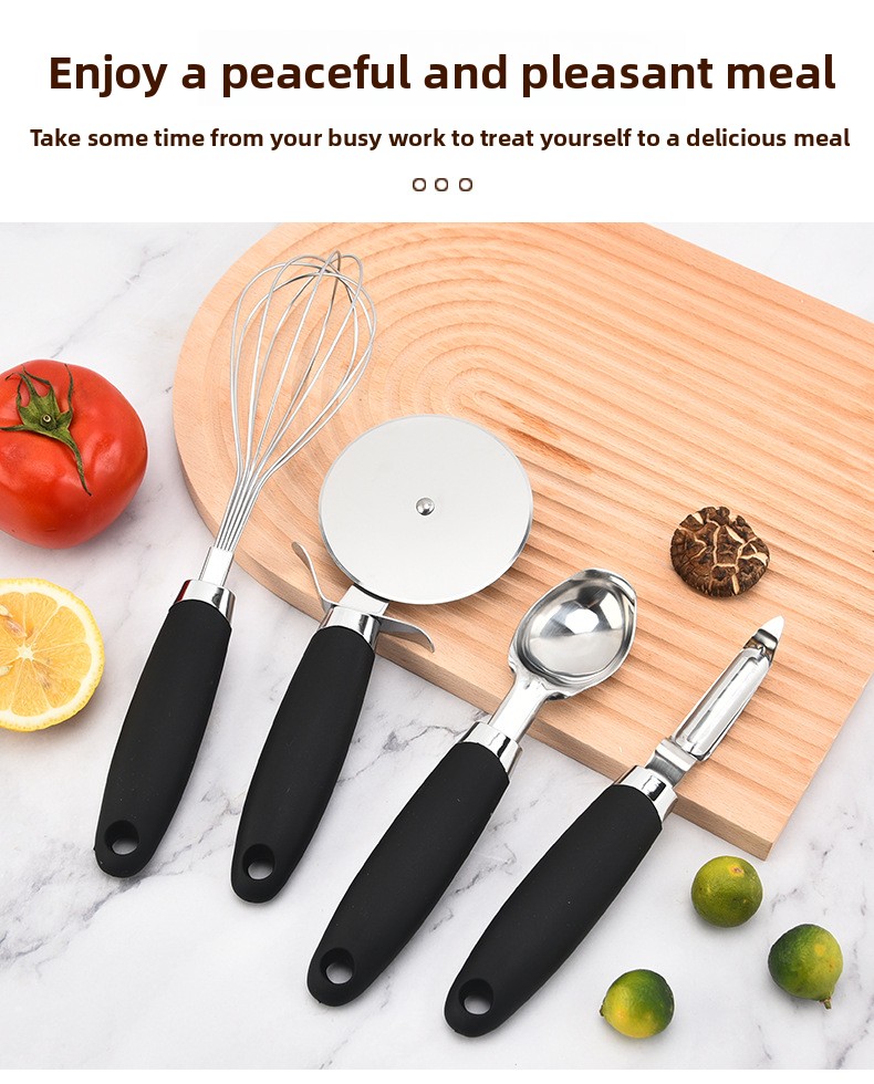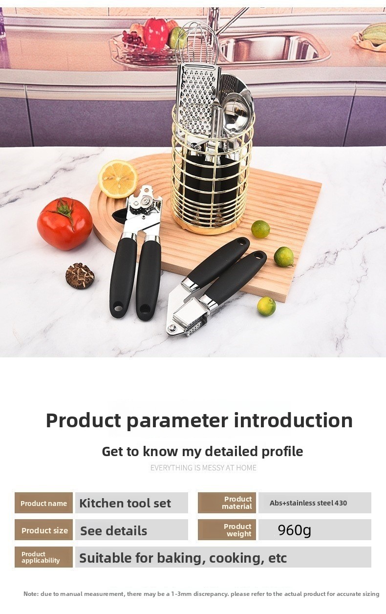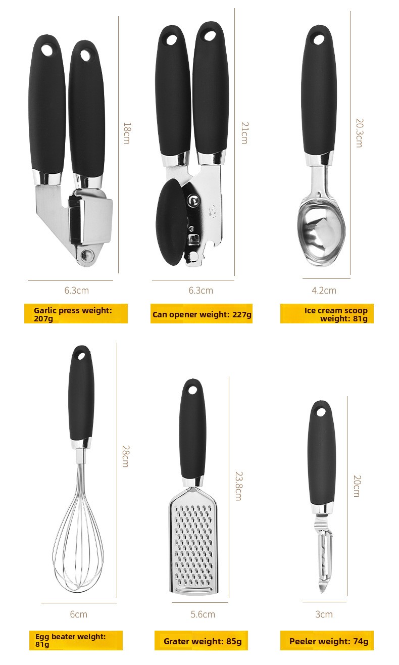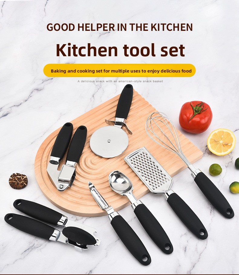 Set Includes: Can opener, pizza cutter, egg whisk, peeler, and other kitchen tools (8-piece set)
